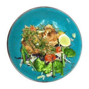 CRUMBED RED SNAPPER WITH GREEN HERB SAUCE