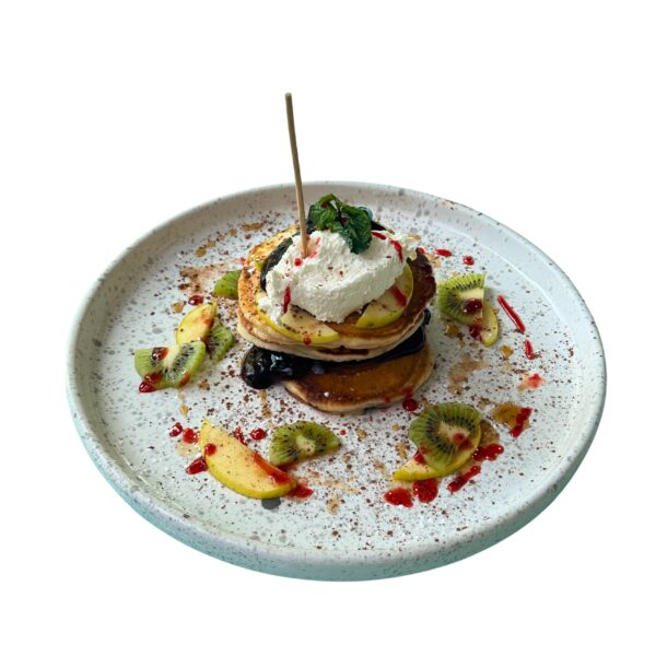 Fluffy Buttermilk Pancakes with Blueberries, Drizzled with Maple Syrup & Whipped Cream