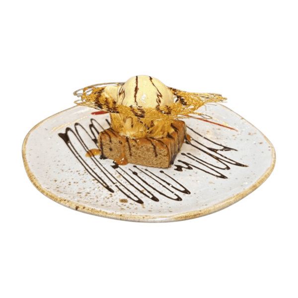 Caramel blondie with butter scotch crunch & and served with vanilla gelato & hot satted caramel sauce