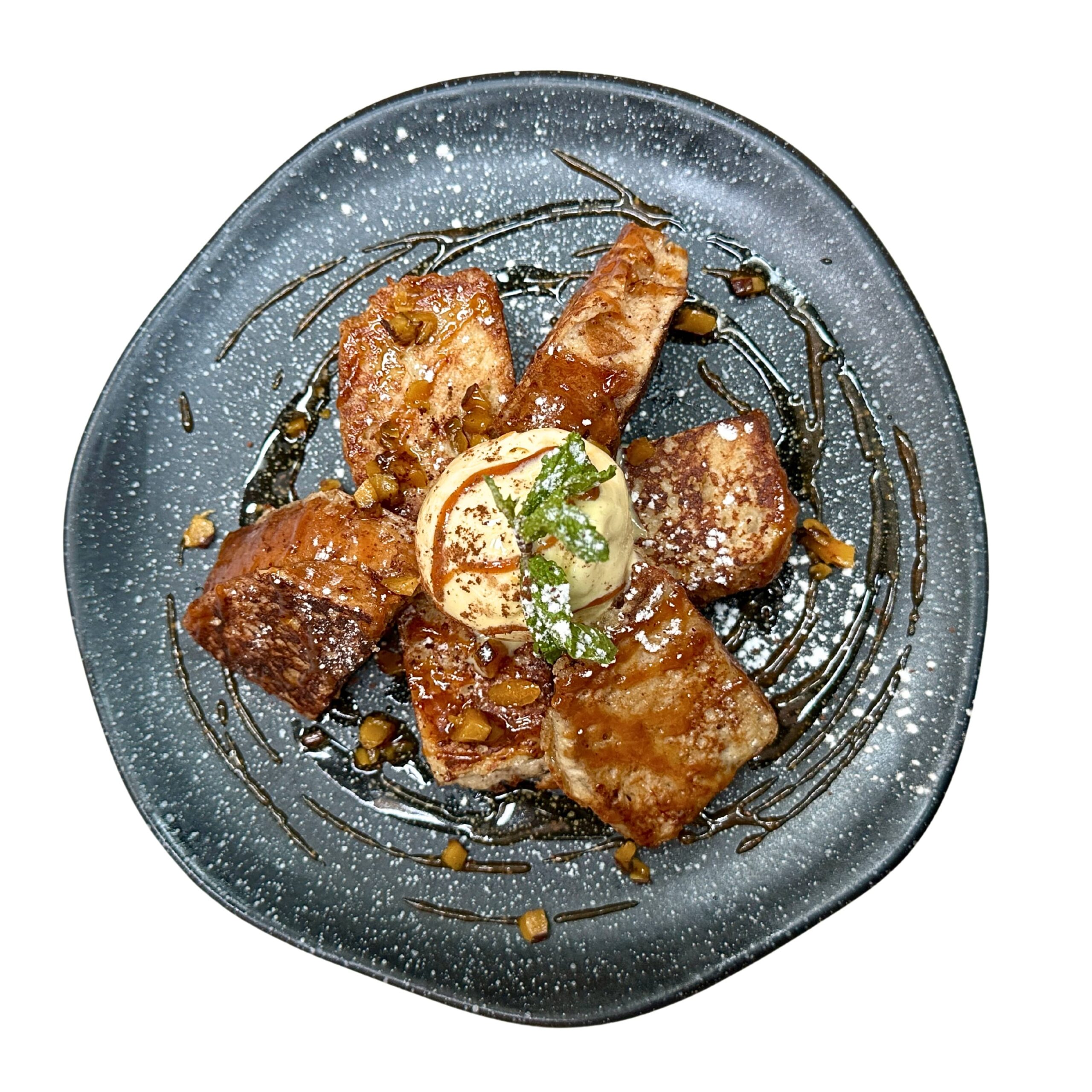 Thick-cut Brioche Drizzled with Caramel and Maple Syrup, Topped with a Sugar Crunch and a Scoop of Homemade Vanilla Gelato.