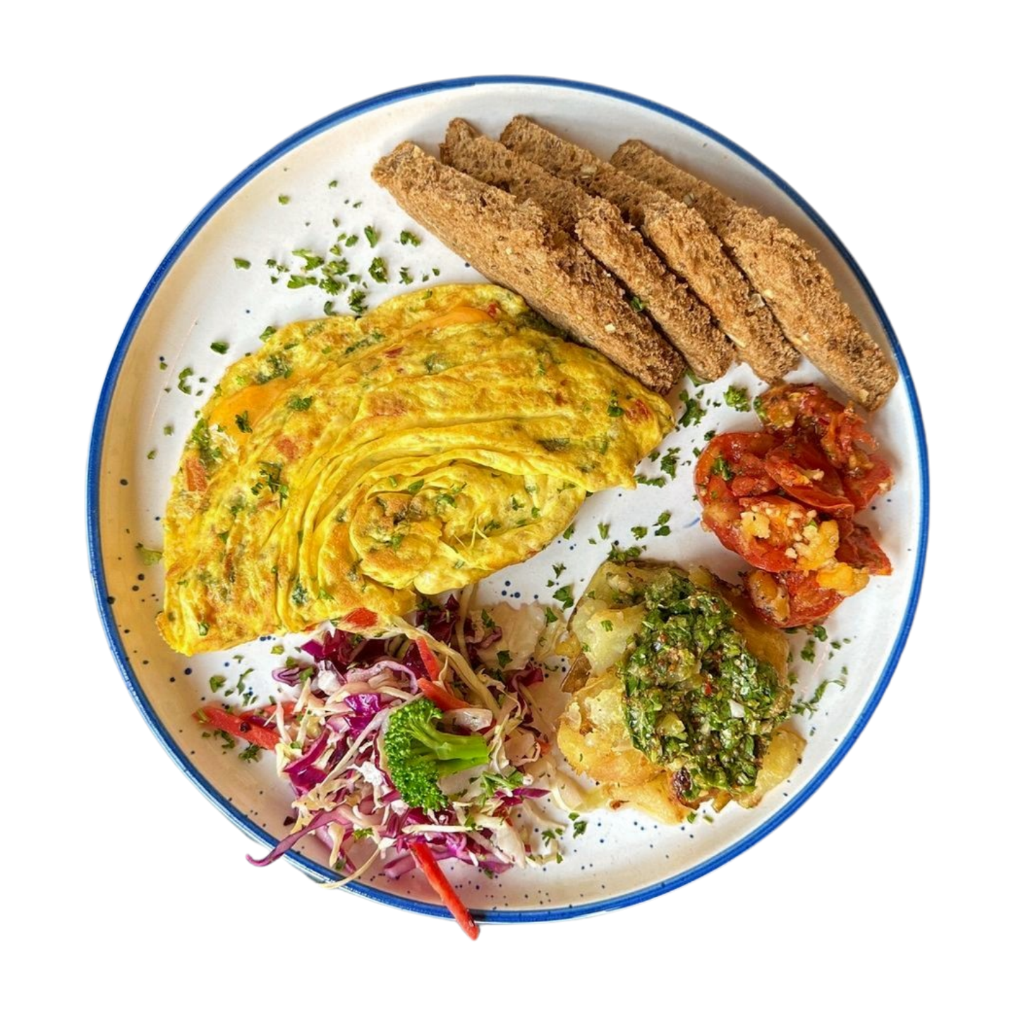 Omelette stuffed with Cheddar, Onions, Tomatoes & Coriander