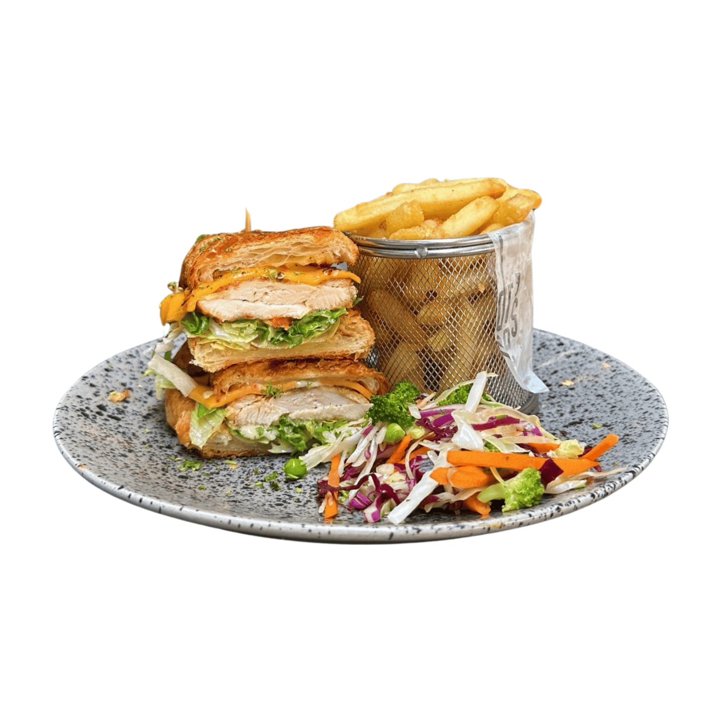 Flaky croissant with grilled chicken cheddar bell poppers chopped iceberg green chilies and a honey mustard mayo