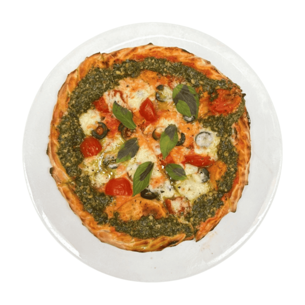 Herbed Chili Basil Pesto, Lightly Roasted Tomato with Sriracha, Black Olives, Wilted Cherry Tomatoes & Fresh Buffalo Mozzarella