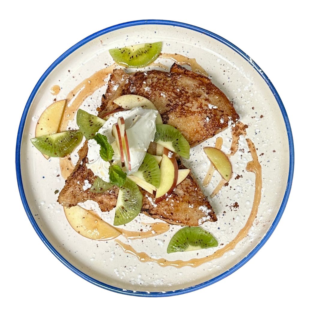 Thick French Toast with a Burnt Granulated Sugar Crust served with Fresh Seasonal Fruits and a Vanilla Infused Whipped Cream