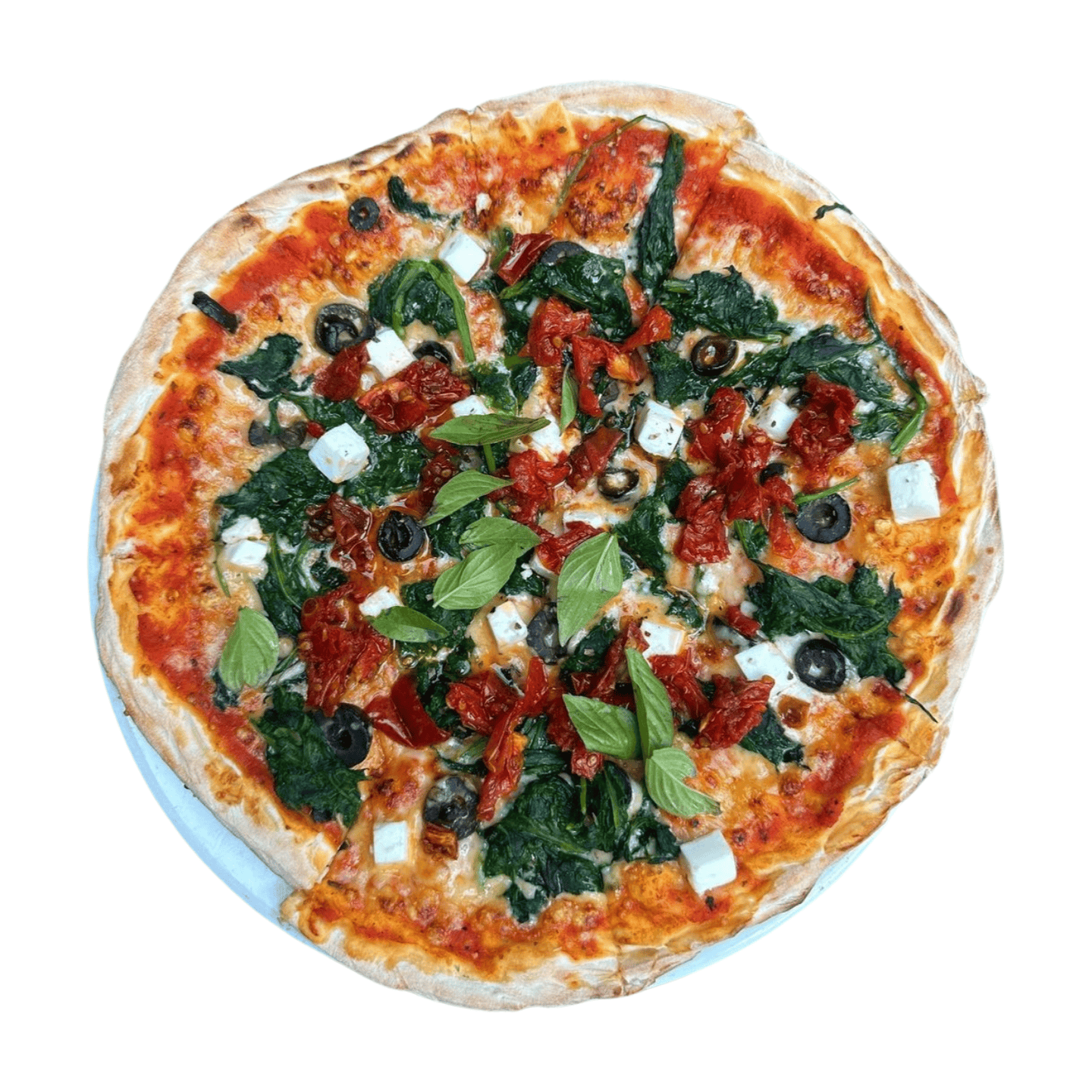 Xander’s Tomato Sauce, Wilted Spinach, Black Olives, Feta Cheese, Sundried Tomatoes Parmesan Regiano and Fresh Basil