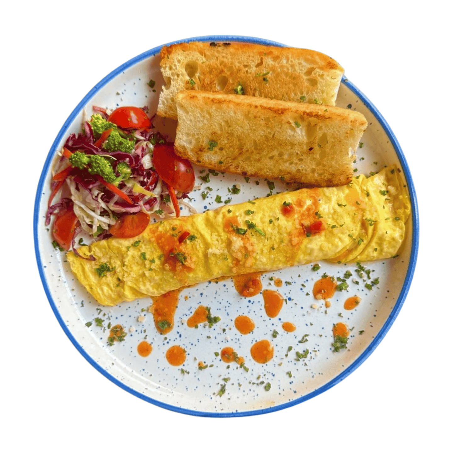 Folded Omelette, Cheddar, Fine Herbs, Rocket and Toasted Focaccia