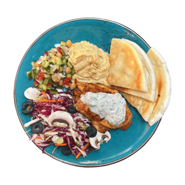 Grilled Chicken with Hummus, Fattosh with Tomatoes, Feta & Olives, and a Serving of Jalapeño Yoghurt & Crispy Pita.