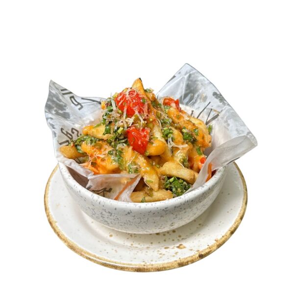 French Fries Loaded with Sriracha Mayo, Jalapeños, Salsa Verde, Cherry Tomatoes, Parmesan Shavings & a Dash of Truffle Oil
