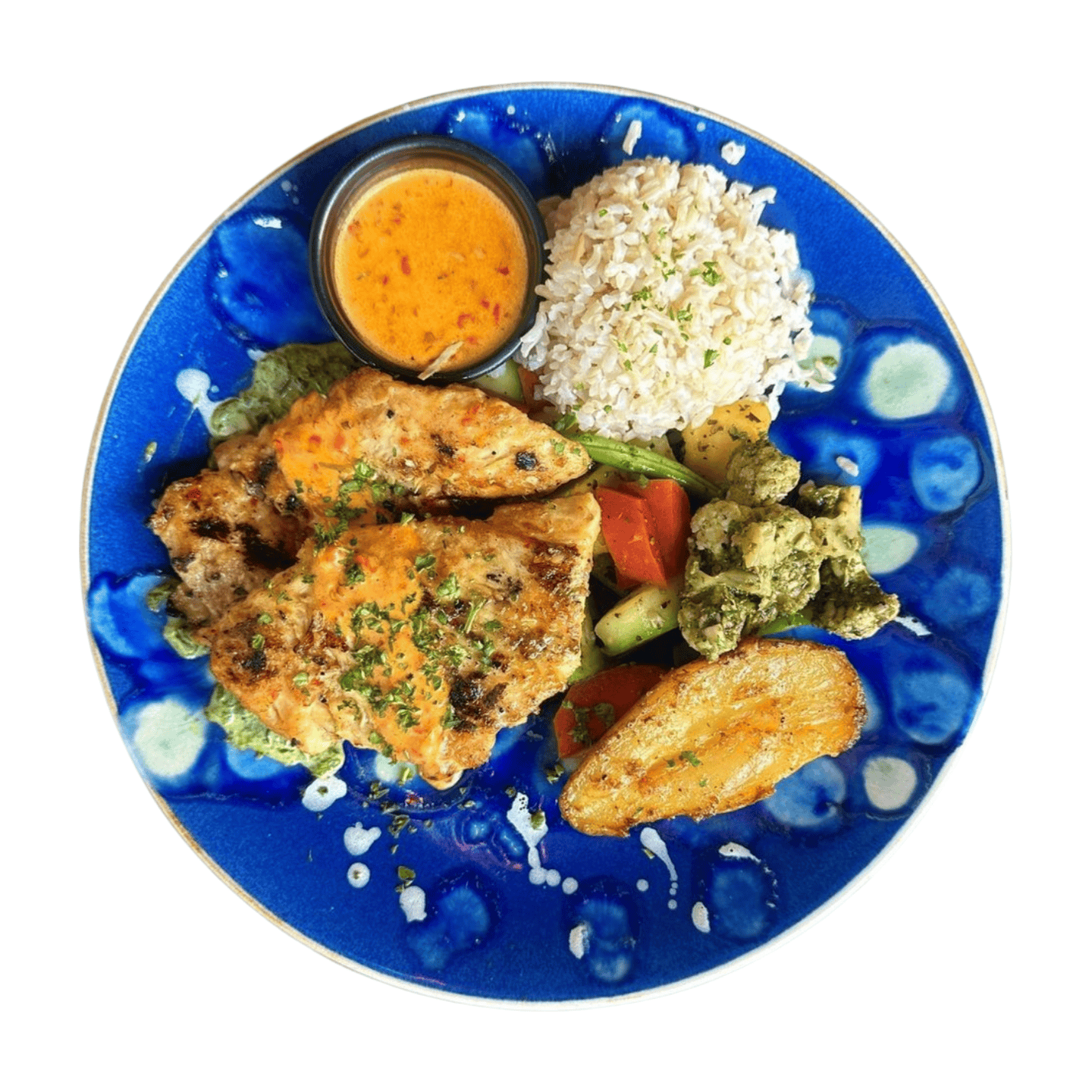 Grilled Chicken with a Sambal Chilli Sauce with Brown Rice & Sauteed Vegetables