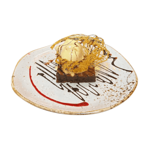 Moist 100% dark Belgian chocolate brownie with raspberries served with vanilla gelato
