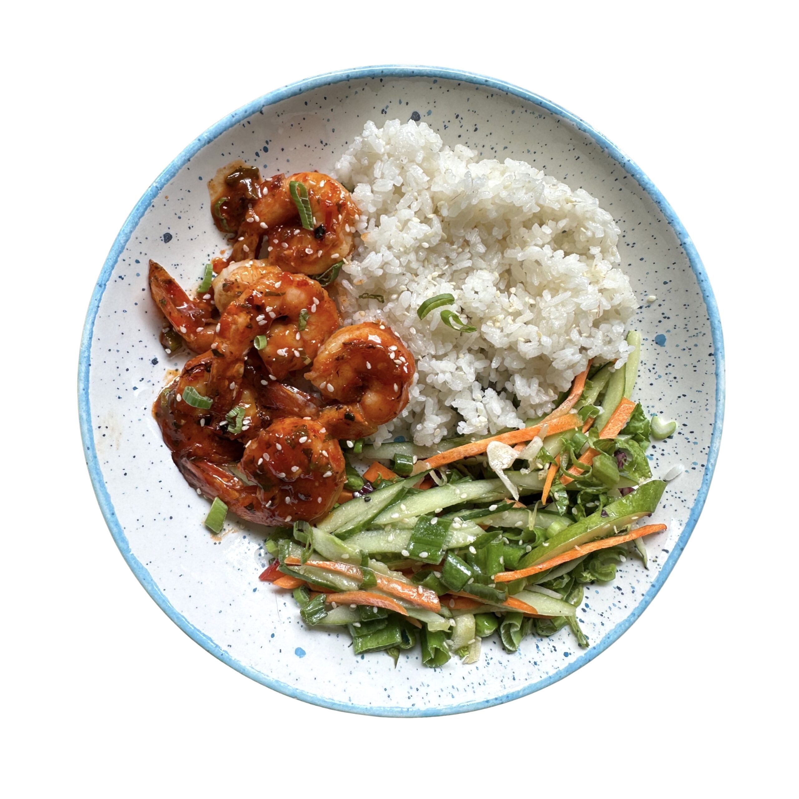 Pan seared prawns with chilli Sambal sauce served with rice and side salad