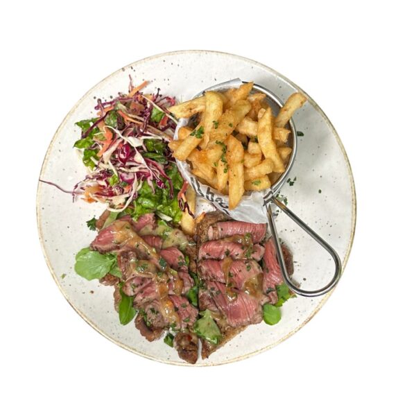 Herb Cruste Premium Roasted Beef with an onion Garlic Marmalade & Bell Peppers served in a Rustic Country Bread