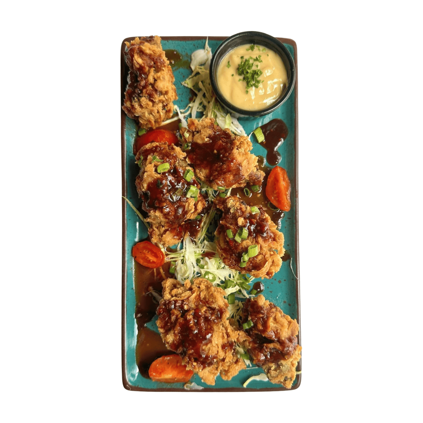 Tonkatsu battered chicken wings with a miso sesame dipping sauce