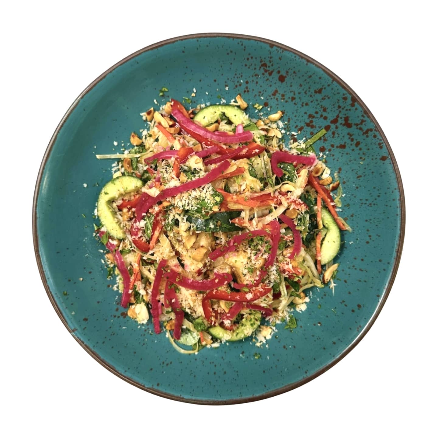 Shredded red Cabbage Lettuce, Cucumber, Tomatoes & Zucchini in a Thai chilli & coconut dressing infused with lemongrass, Toasted Peanuts.